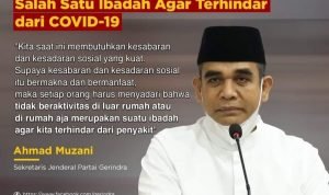 Menurut Muzani, dalam situasi pandemi covid yang terus meningkat ini dibutuhkan kesabaran dan kesadaran sosial yang tinggi. Setiap individu juga harus menyadari bahwa dengan berdiam diri di rumah (#DiRumahAja) juga merupakan suatu ibadah agar terhindar dari covid 19.