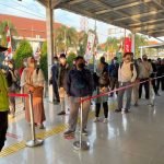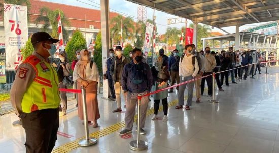 KAI Commuter tetap melayani pengguna kereta rel listrik (KRL) pada 16 dan 17 Agustus 2021. Pagi ini, seluruh calon pengguna KRL antre dengan tertib saat